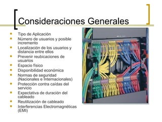 El documento describe consideraciones generales para la elección del cableado, incluyendo el tipo de aplicación, número de usuarios, distancia entre ellos, normas de seguridad y expectativa de duración. También resume ventajas del cable UTP, características de la fibra óptica y redes inalámbricas. Explica conceptos como el cableado horizontal, patch panel, cuarto de telecomunicaciones y cableado vertical.