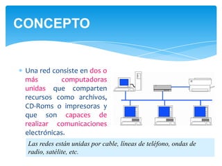 Este documento resume los conceptos básicos de redes informáticas, incluyendo las clases, topologías, cableado y comunicaciones. Brevemente describe las LAN, MAN y WAN, y las principales topologías físicas como bus, anillo y estrella. También cubre los estándares Ethernet 802.3 y WiFi 802.11, y conceptos como CSMA/CD y dominio de colisión.