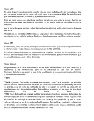 El documento describe diferentes tipos de cables utilizados para la transmisión de datos, incluyendo cable UTP, STP, coaxial y fibra óptica. El cable UTP consiste en ocho hilos de cobre trenzados de dos en dos, el STP añade una malla conductora para reducir interferencias, mientras que el coaxial originalmente era más utilizado pero ahora está en declive debido a su grosor. La fibra óptica transmite datos a través de pulsos de luz guiados por el interior de un fino hilo de vidrio.