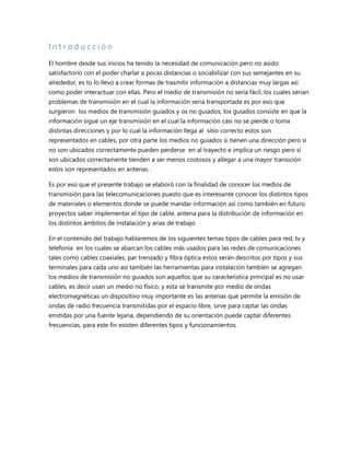 El documento proporciona información sobre diferentes tipos de cables coaxiales y sus especificaciones. Describe cables como RG-11, RG-58, y RG-59, que se usan comúnmente para redes Ethernet, sistemas de CCTV, y sistemas de televisión por cable. También cubre temas como conectores coaxiales, herramientas para cables coaxiales, y consejos para la instalación de cables coaxiales.