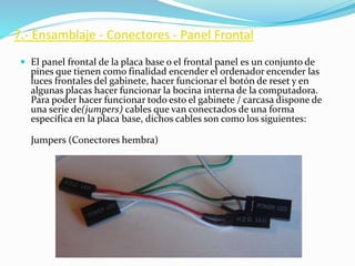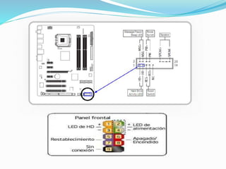 El panel frontal de la placa base conecta los botones y luces del gabinete a la placa base a través de cables llamados jumpers. Los jumpers conectan la luz del disco duro, la luz de encendido, el botón de encendido, el botón de reinicio y la bocina interna a la placa base en ubicaciones específicas descritas en el manual.