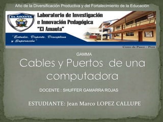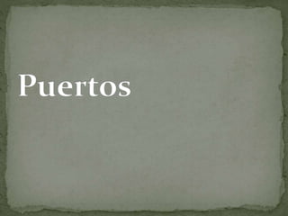 El documento describe diferentes tipos de puertos y conectores utilizados en computadoras y periféricos. Explica que los puertos sirven para conectar dispositivos externos y transferir datos, y que hay puertos paralelos, serie, USB, VGA, DVI y RJ-45 para redes. También menciona conectores de alimentación eléctrica.