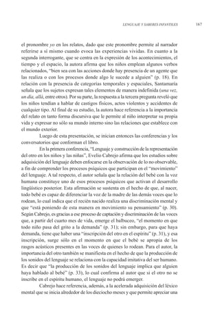 Este documento resume un libro compilado por Flor Alba Santamaría y Martha Helena Barreto que recopila las reflexiones de un seminario internacional sobre el desarrollo del lenguaje y los saberes en la infancia. Incluye tres conferencias de Evelio Cabrejo y tres conversatorios posteriores con especialistas. Cabrejo analiza factores como la importancia de la voz materna y la representación del otro en el desarrollo lingüístico infantil. Los conversatorios exploran temas como la interacción madre-bebé, la música y el juego