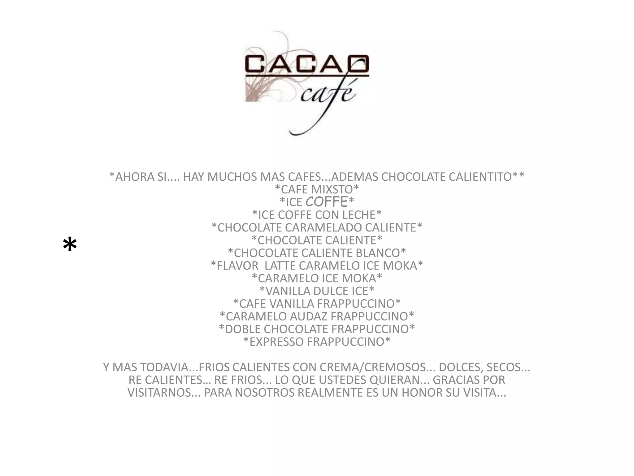 El documento presenta una lista de varias opciones de bebidas de café y chocolate calientes y frías que ahora están disponibles en un café, incluyendo café solo, café con leche, chocolate caliente blanco, bebidas frías como frappuccinos de vainilla y caramelo, y que el café agradece a los clientes por visitarlo.