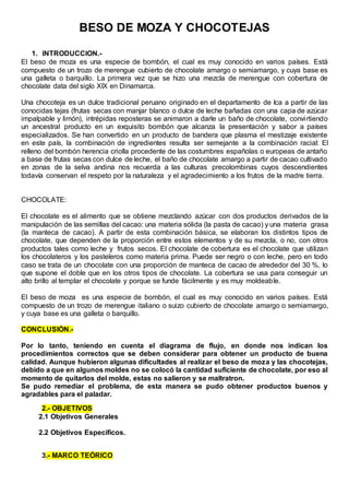 El documento describe los pasos para producir besos de moza y chocotejas. Estos incluyen recibir las materias primas como chocolate, merengue, manjar blanco y frutas secas. Luego se pesan los ingredientes y se siguen los pasos de preparación, que incluyen mezclar, envolver y moldear los productos. Finalmente, se almacenan los dulces terminados. El proceso requiere seguir un diagrama de flujo para asegurar la calidad de los productos finales.