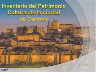 Este documento contiene información sobre varios sitios y monumentos históricos de la ciudad de Cáceres, España. Se describen brevemente la Iglesia de San Francisco Javier, las murallas de Cáceres, la Iglesia Concatedral de Santa María y otros lugares notables como palacios, plazas y edificios históricos dentro del casco antiguo de la ciudad, conocido como la Ciudad Vieja de Cáceres. Para cada lugar se proporciona su ubicación, breve historia, características arquitectónic