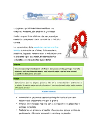 La papelería y cacharrería Don Nicolás es una compañía moderna que ofrece una variedad de productos para oficinas y locales, buscando proporcionar servicios de alta calidad de manera continua. La compañía se especializa en suministros de oficinas, útiles escolares, papelería y juguetes, enfocándose en brindar la mejor asesoría posible a los clientes, quienes son lo más importante. Su misión es comercializar productos y servicios de óptima calidad reconocidos por el gremio, inno