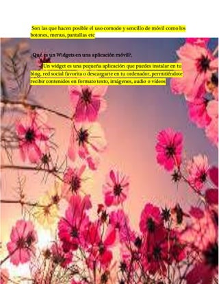 Este documento resume algunos conceptos clave relacionados con aplicaciones móviles, incluyendo que una plataforma abierta sirve como base para hacer funcionar hardware o software compatible, que una aplicación móvil se diseña para ejecutarse en dispositivos móviles como teléfonos inteligentes y tabletas, y que los sistemas operativos móviles más conocidos son iOS, Android y Blackberry OS. También identifica los componentes de interfaz de usuario comunes como botones y menús, y define un widget como una pequeña aplicación que permite recibir