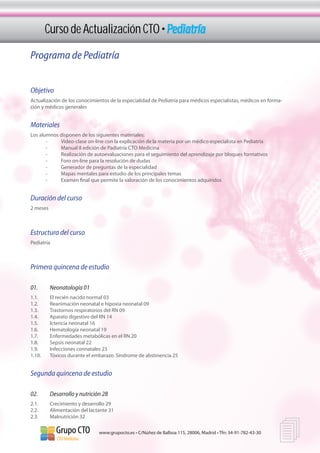 Este documento presenta un curso de actualización en pediatría de 2 meses de duración. El curso se divide en cuatro quincenas de estudio que cubren temas como neonatología, desarrollo y nutrición, aparatos respiratorio y digestivo, hemato-oncología, enfermedades infecciosas, síndrome de muerte súbita del lactante, maltrato infantil y calendario vacunal. Los estudiantes tienen acceso a videos, manuales, foros y evaluaciones para aprender sobre la especialidad.