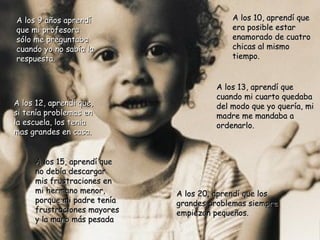 Este documento presenta una serie de lecciones de vida aprendidas en diferentes edades, desde los 9 hasta los 92 años. Algunas de las lecciones clave incluyen aprender que los problemas pequeños pueden convertirse en grandes, que es importante resolver disputas antes de ir a dormir, y que nunca es demasiado tarde para disfrutar de la vida. El mensaje final es que lo más importante no es la edad que alcancemos, sino sentir que hemos vivido con propósito.