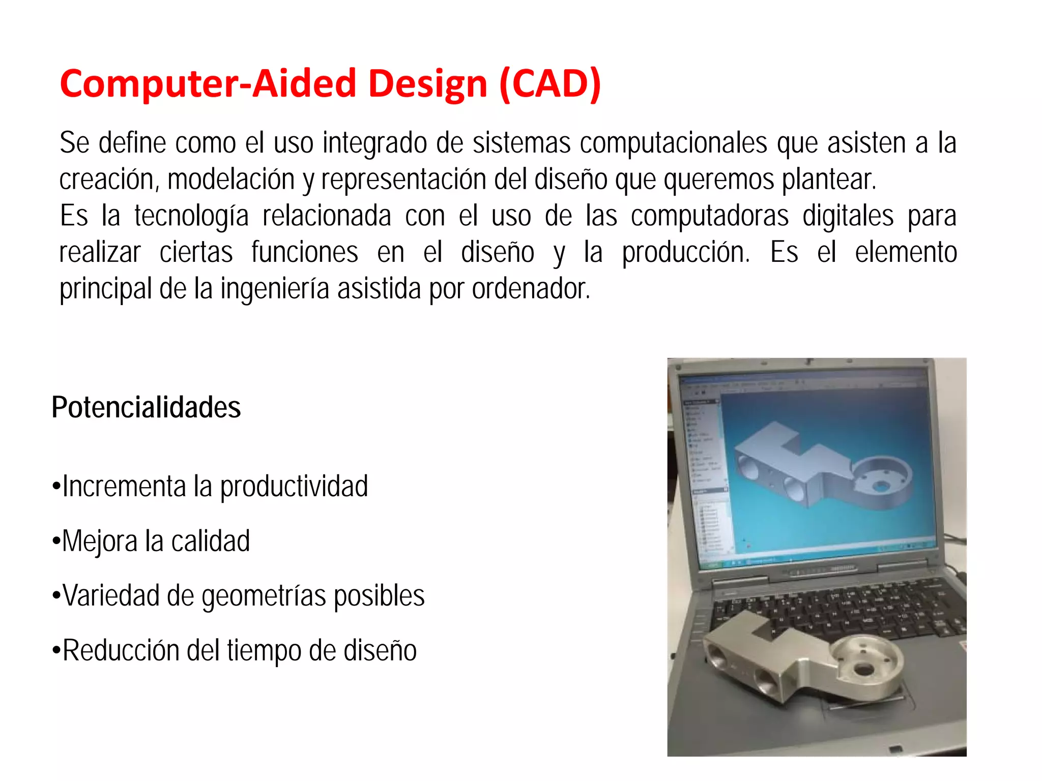 El documento resume los conceptos fundamentales de CAD (diseño asistido por computadora), CAE (ingeniería asistida por computadora) y CAM (manufactura asistida por computadora). CAD se refiere al uso de computadoras para el diseño y modelado de productos. CAE involucra simulaciones para analizar el comportamiento de diseños CAD. CAM se refiere a la traducción de diseños CAD a instrucciones de fabricación para maquinaria CNC.