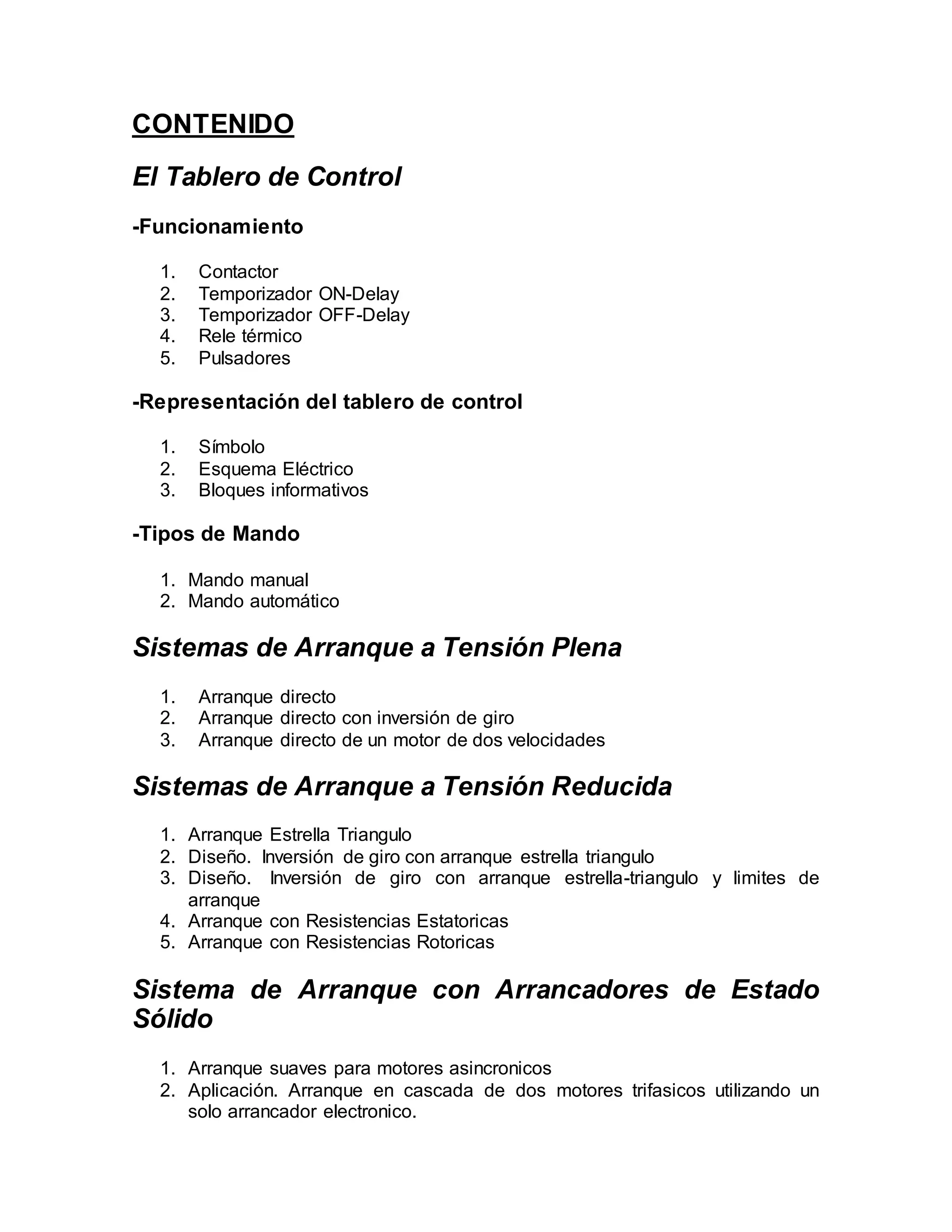 El documento describe diferentes sistemas de arranque para motores asíncronos, incluyendo arranque directo, estrella-triángulo, con resistencias estatoricas o rotóricas, y con arrancadores electrónicos. También presenta aplicaciones como el arranque secuencial de varios motores con un solo arrancador electrónico y diseños que permiten la inversión del giro.