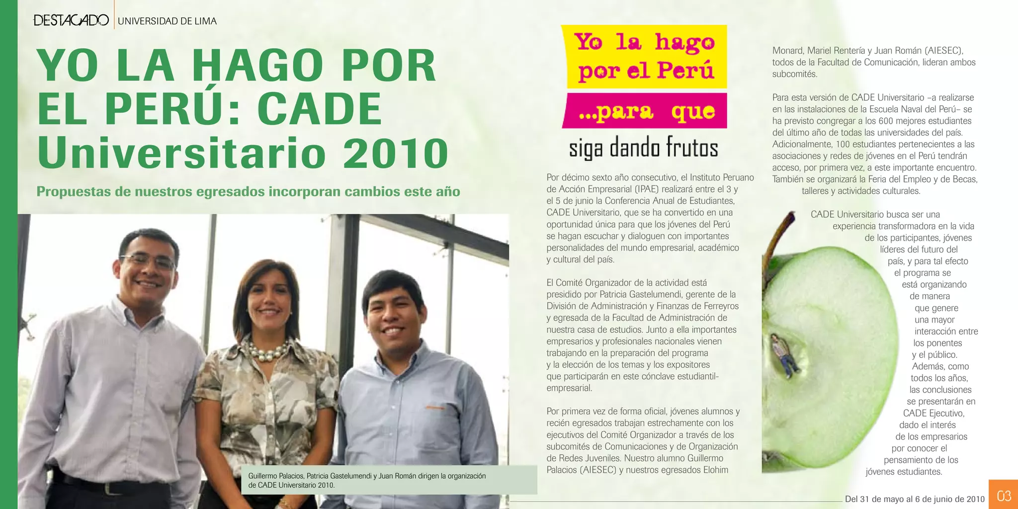 El documento describe la organización de la Conferencia Anual de Estudiantes (CADE Universitario) que se realizará del 3 al 5 de junio. Se espera congregar a 600 estudiantes y 100 jóvenes de asociaciones. Incluirá una feria de empleo y becas, así como talleres y actividades culturales. Los estudiantes de la Universidad de Lima participan en los subcomités de organización.