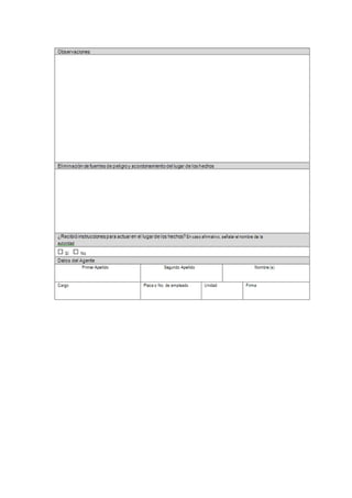 Este documento presenta un protocolo de cadena de custodia para funcionarios públicos en México. Explica los objetivos de estandarizar los procedimientos de actuación en lugares de delitos y garantizar la integridad de las pruebas. Incluye secciones sobre el marco legal, diagnóstico de las prácticas actuales, análisis de brechas, y protocolos detallados para cada etapa de la cadena de custodia, desde la llegada a la escena del crimen hasta la presentación de pruebas en juicio. El propósito final es mejorar la efectividad del