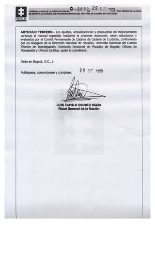 Este manual presenta los procedimientos del sistema de cadena de custodia de la Fiscalía General de la Nación de Colombia. El sistema asegura que los elementos de prueba físicos se manejen correctamente desde que son encontrados en la escena del crimen hasta su disposición final, identificando a los responsables en cada etapa. El manual describe seis procedimientos clave: protección y valoración de la escena, recolección y envío de evidencias, ingreso y análisis en laboratorio forense, ingreso en almacén de evidencias, solicitud de evidencias, y disposición final de