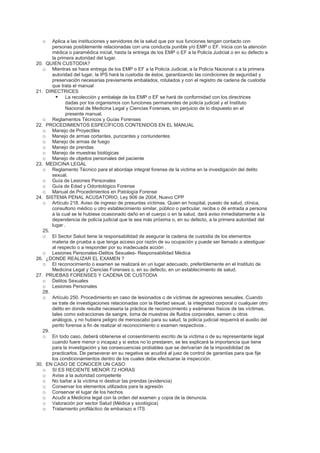 El documento habla sobre la cadena de custodia en investigaciones criminales. Explica que la cadena de custodia asegura que la evidencia física sea embalada y protegida correctamente para evitar su destrucción o contaminación. También describe los procedimientos específicos que debe seguir el personal médico para preservar la evidencia recopilada de víctimas de delitos, como lesiones personales o delitos sexuales.