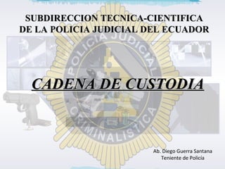 Este documento describe el concepto, objetivos y proceso de la cadena de custodia en la investigación criminal. La cadena de custodia se refiere al procedimiento para garantizar la seguridad, preservación e integridad de las pruebas desde el lugar del crimen hasta su presentación ante la autoridad competente. El proceso incluye el levantamiento, embalaje, rotulación y traslado de las pruebas así como su almacenamiento, análisis y disposición final. Siguiendo este proceso se asegura la legalidad y valor probatorio de las pruebas en el