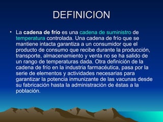 El documento describe los aspectos clave de la cadena de frío en la industria farmacéutica. Explica que la cadena de frío mantiene los productos farmacéuticos como vacunas a temperaturas controladas durante la producción, transporte, almacenamiento y venta para garantizar su efectividad. También describe los procesos básicos de almacenamiento, transporte y distribución requeridos, así como las recomendaciones para el uso y mantenimiento adecuado de neveras y refrigeradores domésticos para almacenar vacunas de manera seg