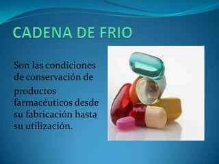 La cadena de frío es importante para conservar productos farmacéuticos como vacunas desde su fabricación hasta su uso. Se debe mantener las temperaturas recomendadas durante el almacenamiento, transporte y distribución para garantizar la efectividad de las vacunas. Esto requiere recursos como neveras, cajas isotérmicas, termómetros y el registro y monitoreo constante de las temperaturas.
