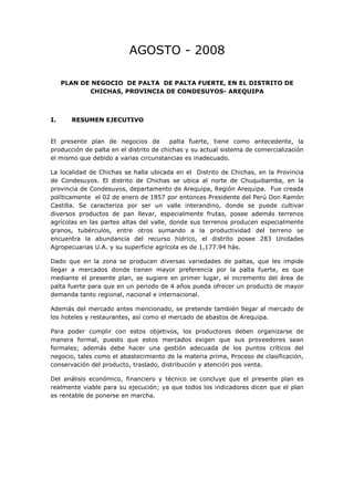 Este documento presenta un plan de negocios para la producción y comercialización de palta fuerte en el distrito de Chichas, provincia de Condesuyos, Arequipa. Actualmente en la zona se producen diversas variedades de palta que dificultan llegar a mercados que prefieren la palta fuerte. El plan propone incrementar el área de cultivo de palta fuerte para ofrecer un producto estandarizado y de mayor demanda en los mercados regional, nacional e internacional. Asimismo, se analizan factores como requisitos de calidad