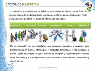 Este documento presenta una introducción a la cadena de suministro, incluyendo sus fases, importancia estratégica, aspectos globales y administración. Se describen las estrategias, selección de proveedores y administración de la logística. Finalmente, se discute la medición del desempeño de la cadena de suministro.