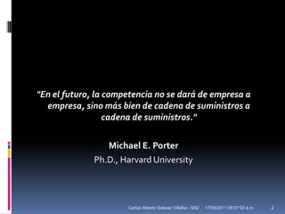 La cadena de suministro se refiere a la red de instalaciones y medios de distribución que gestionan la obtención de materiales, transformación en productos y distribución a consumidores. La gestión de la cadena de suministro busca coordinar mejoras continuas en las relaciones entre actores mediante la evaluación de la infraestructura de comunicación y movilización. Un objetivo estratégico clave es aumentar la autonomía de los actores para formular e implementar planes que mejoren la productividad, el servicio al cliente y los procesos administrativos