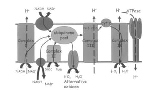 El documento describe los procesos de transporte de electrones y fosforilación oxidativa en la mitocondria para generar ATP. Se explica que los electrones son transportados a través de una cadena de transporte de electrones en la membrana interna mitocondrial, bombeando protones hacia el espacio intermembrana y creando un gradiente electroquímico. La energía de este gradiente se utiliza por la ATP sintasa para fosforilar ADP en ATP.