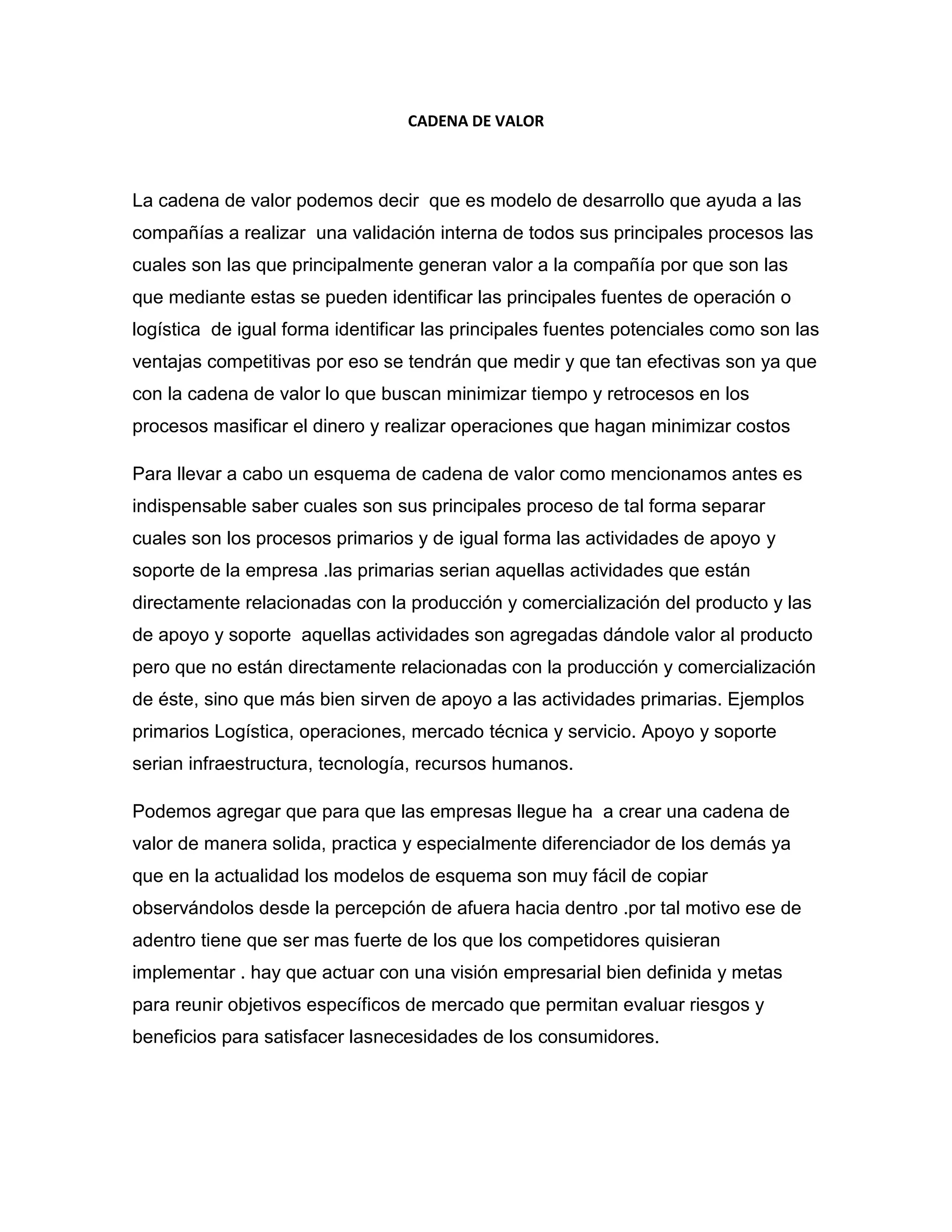 La cadena de valor es un modelo que ayuda a las compañías a evaluar y mejorar sus procesos internos clave para generar valor. Identifica las actividades primarias y de apoyo para medir su efectividad y minimizar costos. Para implementarla con éxito, una empresa debe entender cuáles son sus procesos primarios y de soporte, y desarrollar una visión y objetivos de mercado diferenciados que satisfagan a los consumidores mejor que la competencia.