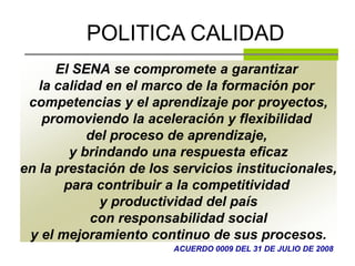 Este documento presenta la cadena de valor institucional del SENA, la cual está compuesta por procesos de innovación, procesos de valor y procesos de apoyo. Los procesos de innovación incluyen inteligencia organizacional, convenios y alianzas, y planeación estratégica. Los procesos de valor son normalización de competencias laborales, diseño curricular, administración educativa, ejecución de la formación, ejecución de servicios complementarios, evaluación y certificación de competencias laborales y gestión para el empleo. Finalmente, los