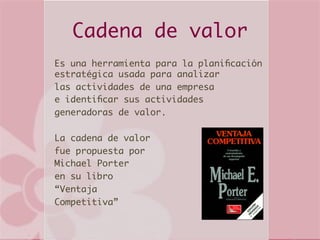 La cadena de valor es una herramienta de planificación estratégica propuesta por Michael Porter para analizar las actividades de una empresa y su generación de valor. Se divide las actividades de una empresa en actividades primarias como producción, marketing y postventa, y actividades de apoyo como recursos humanos, tecnología e infraestructura. El análisis de la cadena de valor permite identificar fortalezas y debilidades para aprovechar ventajas competitivas.