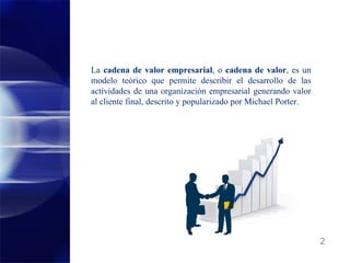 La cadena de valor empresarial es un modelo que describe las actividades de una organización que generan valor al cliente, destacando la importancia de maximizar el valor y minimizar costos. Incluye cinco actividades primarias: logística interna, operaciones, logística externa, marketing y ventas, y servicio, además de actividades secundarias que apoyan estas funciones. El análisis de la cadena permite identificar ventajas competitivas y optimizar costos, utilizando tecnología de información para mejorar la eficiencia.