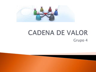 La cadena de valor describe el conjunto de actividades que una empresa realiza para diseñar, producir, comercializar, entregar y dar servicio a sus productos. Está compuesta por actividades primarias como logística interna, operaciones, logística externa, mercadotecnia y ventas, y servicio, así como actividades de apoyo como abastecimiento, desarrollo tecnológico, administración de recursos humanos e infraestructura empresarial. El objetivo es mostrar cómo la empresa crea valor para sus clientes a lo largo de estos