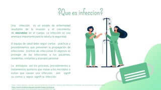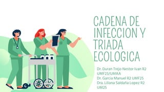 El documento describe la cadena de infección y la triada ecológica. La cadena de infección explica cómo un patógeno se transmite de un huésped a otro a través de una fuente, reservorio, puerta de salida, modo de transmisión, puerta de entrada y huésped susceptible. La triada ecológica consta de tres elementos - agente, huésped y ambiente - que deben interactuar para que ocurra una enfemedad.