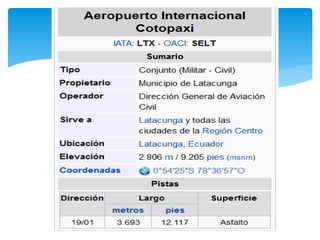 El Aeropuerto Internacional de Cotopaxi en Latacunga está operativo y busca atraer más aerolíneas de carga y pasajeros. Actualmente despacha al menos 80 toneladas de productos como flores, frutas y pescado semanalmente con Cargolux, una importante aerolínea de carga europea. Varias empresas como Pisque, EMSA y Centurion Cargo brindan servicios de almacenamiento, embarque, desembarque y transporte de mercancías en la cadena de suministro del aeropuerto.