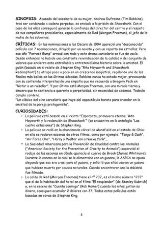 La película Cadena Perpetua de 1994, dirigida por Frank Darabont y basada en un relato de Stephen King, narra la historia de Andy Dufresne (Tim Robbins), quien es condenado a cadena perpetua injustamente y enviado a la prisión de Shawshank. En la prisión, Andy gana la confianza del director y el respeto de los presos, especialmente de Red (Morgan Freeman). A lo largo de los años y a pesar de las dificultades del sistema carcelario, la amistad entre Andy y Red les da esperanza para sobrevivir con dign