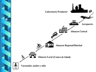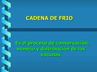 La cadena de frío es el proceso de conservación, manejo y distribución de vacunas. Consta de tres niveles: central, regional y local. En el nivel local, las vacunas se almacenan en heladeras a temperaturas entre 2-8°C y se transportan en termos. Es importante monitorear las temperaturas y seguir procedimientos como no congelar las vacunas para mantener su efectividad.