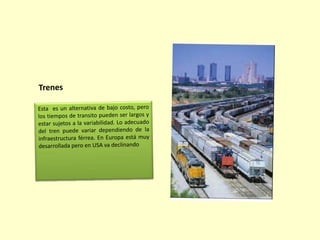 El documento describe los conceptos clave de la cadena de suministro y la logística. Explica que una cadena de suministro incluye a todos los involucrados en satisfacer la demanda de un cliente, como fabricantes, proveedores, transportistas y almacenistas. También describe los diferentes tipos de sistemas de gestión de la cadena de suministro, las estrategias y clasificaciones de productos, procesos y cadenas de suministro. Finalmente, explica las diferentes actividades logísticas y la clasificación de la logística en entrada, operacional,