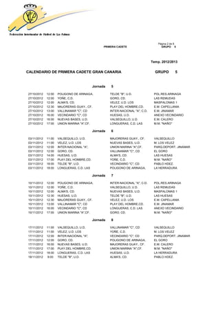 Este documento presenta el calendario de partidos de la Primera Cadete en Gran Canaria para la temporada 2012/2013. Incluye 11 jornadas con los días, horas y lugares de los partidos entre los 16 equipos participantes del Grupo 5.