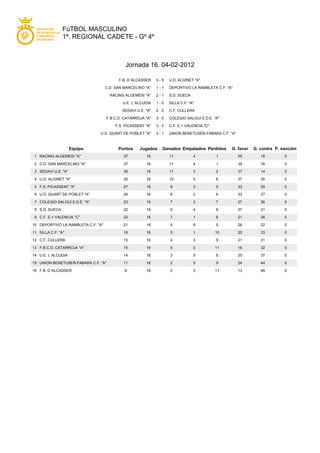 Este documento presenta los resultados de la 16a jornada de la 1a Regional Cadete en fútbol masculino. Racing Algemesí "A" y CD San Marcelino "A" lideran la tabla con 37 puntos cada uno, mientras que Sedavi UE "A" se ubica tercero con 36 puntos. FBD Alcasser se encuentra en última posición con 9 puntos.