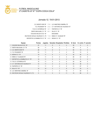 Este documento resume los resultados de la 12a jornada de la 2a categoría cadete de la Copa Coca Cola. Los equipos C.D. Monte Sion "B", Santa Ana Albal C.F. "B" y Colegio Salgui E.D.E. "B" encabezan la tabla de posiciones con 26, 26 y 27 puntos respectivamente.