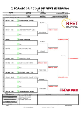 Este documento presenta el cuadro de competición del torneo cadete masculino del Club de Tenis Estepona. Contiene la lista de 16 jugadores participantes con su número de licencia y ranking, así como el emparejamiento de cada ronda. Se especifican los cabezas de serie y las fechas y horas de los partidos programados hasta la final.