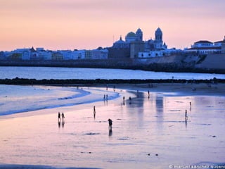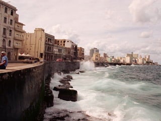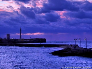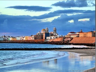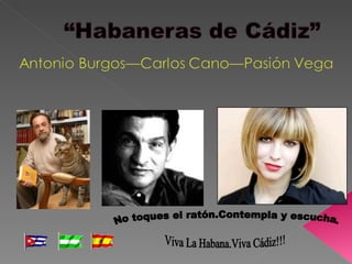 Este documento presenta la canción "Habaneras de Cádiz", con letra de Antonio Burgos y música de Carlos Cano. La canción es interpretada por Pasión Vega y compara La Habana y Cádiz, señalando sus similitudes culturales a pesar de la distancia geográfica. El documento invita a escuchar la canción de nuevo y promueve el sitio web de su autor, GONPE, dedicado al arte.