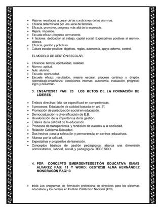 El documento presenta una revisión crítica de la literatura sobre la gestión escolar. Aborda cinco concepciones de la gestión, factores que explican la calidad educativa como la formación de directivos y el proyecto escolar. También analiza tendencias en la gestión de centros educativos, el movimiento de escuelas eficaces y modelos de gestión escolar. Se discuten temas como la profesionalización de directivos, la participación social, y el mejoramiento continuo de la calidad educativa.