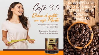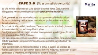 El documento presenta los beneficios de una mezcla de café gourmet, yerba mate, garcinia mangostana y psyllium microencapsulado, destacando sus propiedades para la salud como la mejora en la memoria, prevención del cáncer y ayuda en el control de diabetes. También describe cómo cada ingrediente contribuye a la salud, desde propiedades antioxidantes y antiinflamatorias hasta efectos diuréticos y de regulación del colesterol. Se proporcionan recomendaciones sobre la preparación y el consumo del café para maximizar sus beneficios.