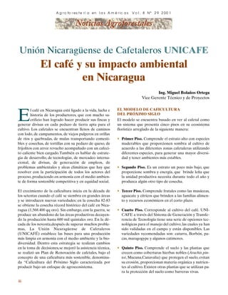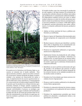 El documento describe el modelo de caficultura del próximo siglo propuesto por UNICAFE en Nicaragua. El modelo divide el cafetal en cinco pisos ecológicos que incluyen árboles para sombra, frutales, el cultivo de café y plantas de cobertura del suelo. El objetivo es producir café de manera sostenible y amigable con el medio ambiente. UNICAFE también sugiere acciones como aplicar leyes ambientales, capacitar a los productores, y promover formas de producción que conserven los recursos naturales.