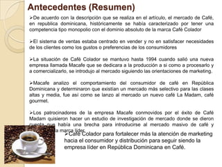 El documento describe el caso de Café Doña Pacha, una empresa de café molido en la República Dominicana. Históricamente, el mercado de café estaba dominado por Café Colador. Más tarde, una nueva empresa llamada Macafé introdujo una marca de café gourmet llamada Café La Madam para un mercado más selecto. Esto llevó al señor Pelele a considerar relanzar la marca Café Doña Pacha u introducir una nueva marca para competir en el mercado masivo.