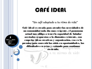 Café Ideal es una empresa venezolana que busca consolidarse como una marca innovadora y de calidad en Venezuela y expandirse a nivel internacional. La empresa se enfoca en satisfacer las necesidades de los consumidores de manera adaptable a sus estilos de vida. Café Ideal también se compromete con la responsabilidad social a través de programas de educación, salud y desarrollo comunitario. La empresa busca mejorar continuamente sus productos, ampliar su portafolio y expandir su presencia a nuevos estados para posicionarse como la marca preferida de los
