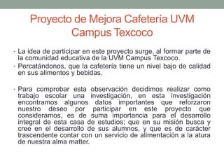 El documento presenta un proyecto de mejora para la cafetería del Campus Texcoco de la Universidad del Valle de México. El proyecto busca mejorar la calidad de los alimentos, la limpieza, la rapidez del servicio y generar confianza en los clientes a través de estrategias como certificaciones, encuestas de satisfacción y la inclusión de estudiantes en las operaciones de la cafetería.