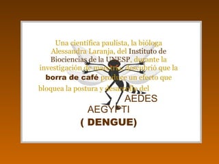 Una investigación descubrió que la borra de café bloquea el desarrollo del mosquito Aedes aegypti que transmite el dengue. Colocando borra de café en recipientes de agua se puede combatir al mosquito de forma efectiva y a bajo costo. Además, la borra de café altera enzimas del mosquito y puede usarse como abono ecológico. Esto no había sido divulgado antes porque las municipalidades recaudan dinero de los esfuerzos contra el mosquito.