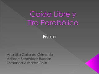 El documento trata sobre diferentes tipos de movimiento como la caída libre, el tiro parabólico y el movimiento de proyectiles. Explica que la caída libre es el movimiento que experimentan los objetos solo bajo la influencia de la gravedad, con una aceleración constante de aproximadamente 9.8 m/s2 hacia abajo. También define el tiro parabólico como el movimiento en dos dimensiones sobre un plano con una trayectoria curva, resultado de la combinación de movimiento horizontal y vertical, pudiendo ser horizontal u oblicuo.